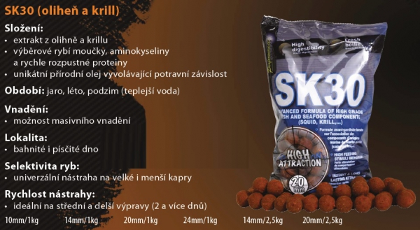 SK 30 je stabilná generácia boilies rady Concept, špeciálne vyvinutá pre splnenie nutričných požiadaviek kaprov od popredného francúzskeho kaprárskeho špecialistu firmy Starbaits. Boilies Starbaits SK 30 je vytvorené z vysoko kvalitných a čisto prírodných surovín, bez akéhokoľvek použitia syntetických príchutí. Boilies SK30 obsahuje len vybrané suroviny majúce extrémne vysokú lákaciu schopnosť (výťažok z kalmára a krilu, rybiu múčku sušenú pri nízkej teplote a rozpustné rybie proteíny). Unikátna skladba amino-kyselín a mastných kyselín priťahuje kapre všetkých veľkostí. Špeciálne upravený prírodný olej, známy svojou stimuláciou rybích čuchových orgánov, napomáha ľahkej lokalizácii nástrahy.